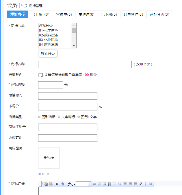 在此頁面可以根據自己實際情況,選擇要發布的商標信息,包括:商標類別、名稱、價格(包括出售價及市場價,市場價僅供買家參考)、申請時間、類型、注冊號、類似群組、圖片上傳以及簡要的文字說明,確認無誤后即可點擊提交,待我們客服人員審核完畢后,即可在前臺出現,成功上架。