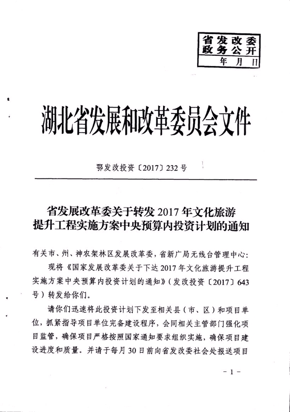 省發改委關于轉發2017年文化旅游提升工程實施方案中央預算內投資計劃的通知