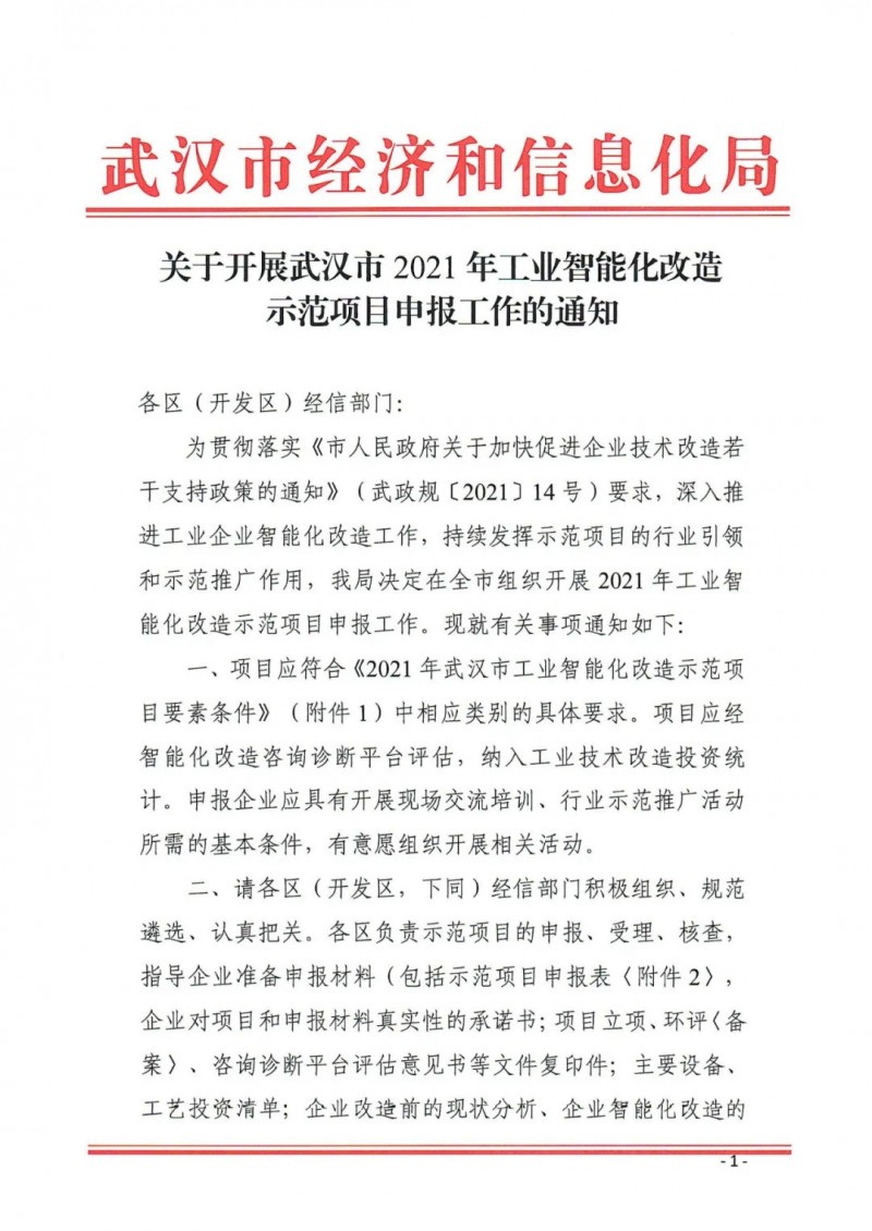 關(guān)于開(kāi)展武漢市2021年工業(yè)智能化改造示范項(xiàng)目申報(bào)工作的通知